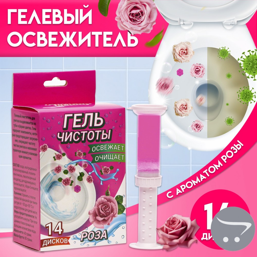 Гелевый освежитель аромат – роза с дозатором высокоэффективное средство обеспечивающее свежесть и чистоту. При каждом смывании гель постепенно растворяется, оставляя унитаз чистым и свежим. Установите гелевый освежитель там, где интенсивность проходимость воды выше. Для того чтобы достичь максимальной эффективности установите освежитель с 2-х сторон унитаза.